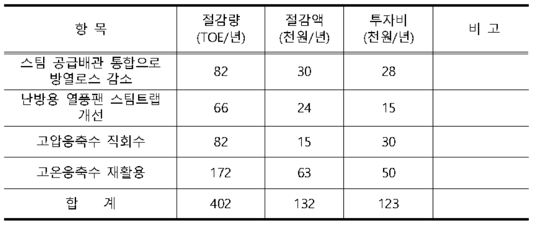 을 수립하였다. 개선 방안은 스팀 공급에서 응축수 회수까지 광범위 하게 다수의 아이디