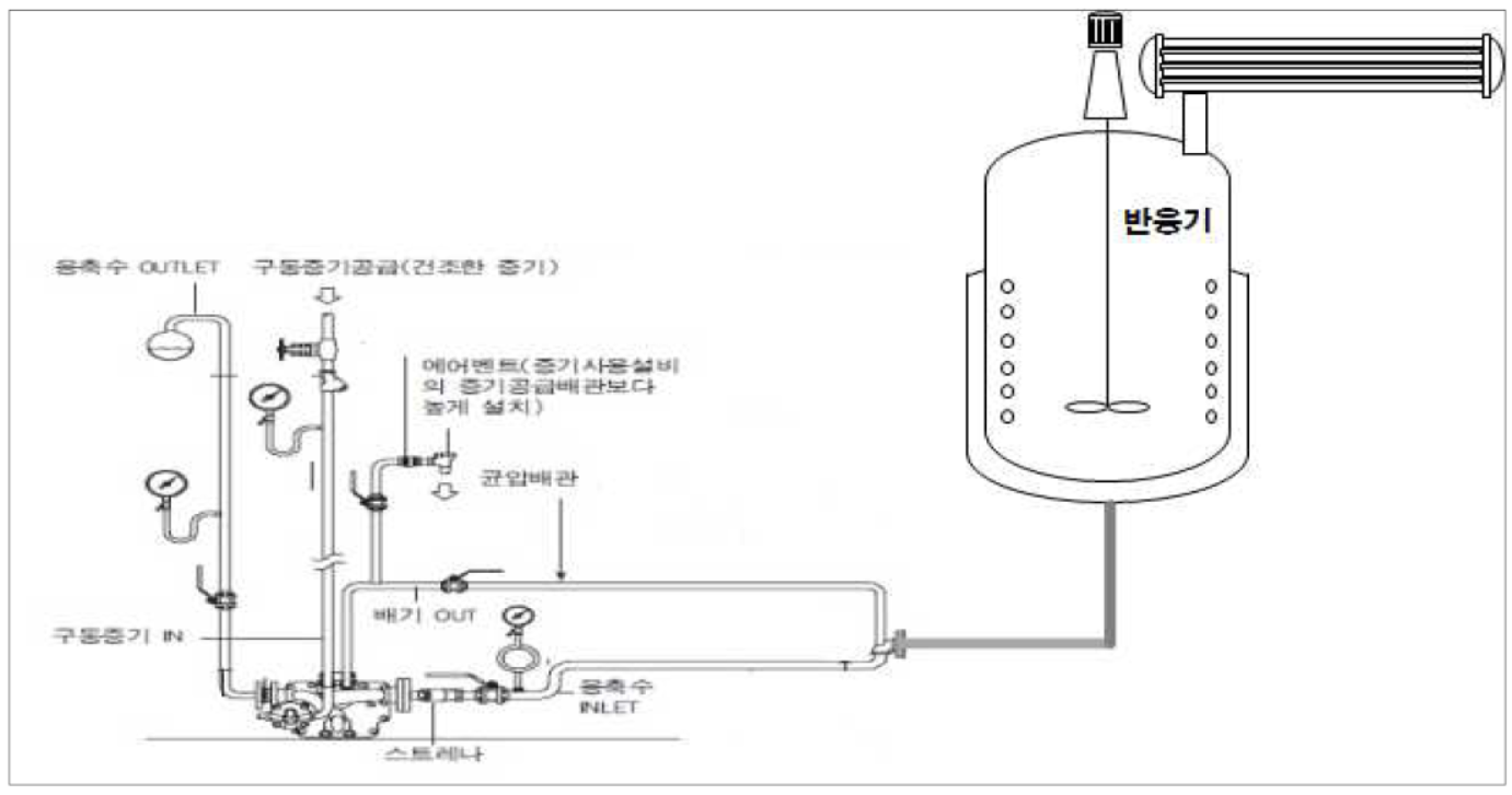 - 수지 생산공정 반응기에 가열원으로 공급되는 스팀(Steam)은 가열 후 스팀트랩을 이용