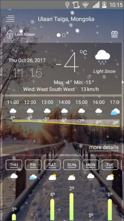 날씨 앱을 이용하면 현재 위치의 일기 예보를 자동으로 감지되어, 날씨 기류에 기압, 기상 조건과 시야 거리 그리고 상대 습도 등의 서로 다른 단위의 강수량, 이슬점, 풍속 및 방향과 10일 미래 예보 및 시간별 일기 예보가 포함되어 상세한 내용으로 다양하게 활용이 가능합니다.