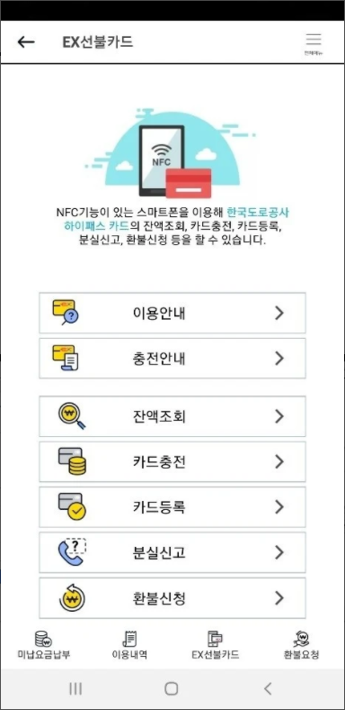 휴대기기의 NFC를 통해 선불카드 관련 서비스를 제공 받으실 수 있습니다.