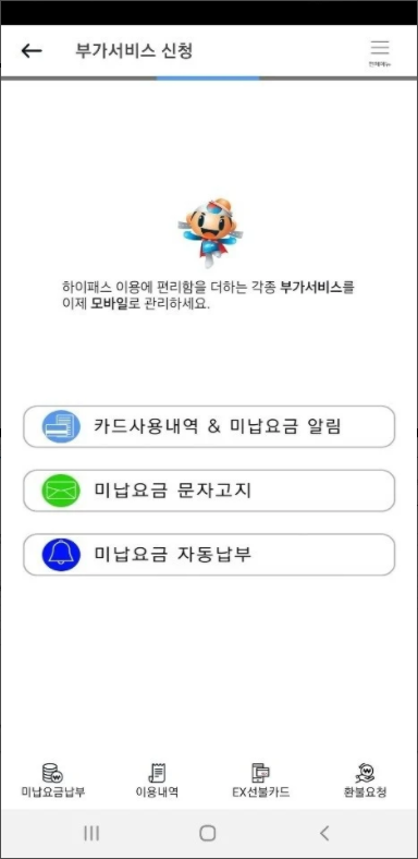 하이패스 이용할때 통신 및 단말기 오류로 고속도로통행료미납 요금이 발생되면 빠르게 미납요금 조회가 가능하고 미납요금은 하이패스 카드에서 직접 납입이 할수 있읍니다. 또한 하이패스 사용내역 조회가 가능하고 고속도로 통행료 영수증도 일자별로 구분하여 여러장을 한번에 출력 가능합니다.