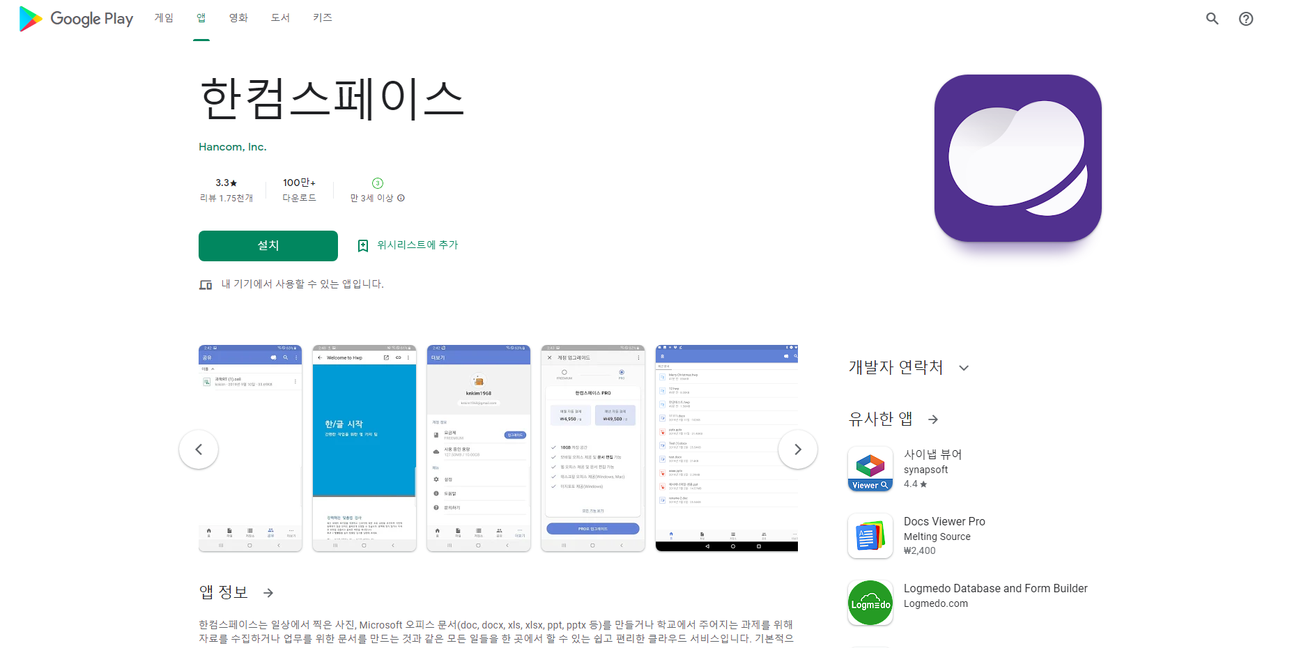 - 저장소: 내 기기에 저장된 파일을 보고, 편집하고, 저장하고, 한컴스페이스 클라우드 스토리지에 업로드할 수 있도록 허용합니다.